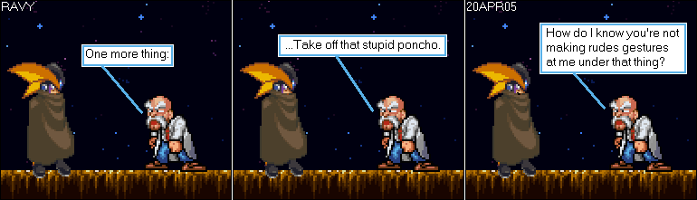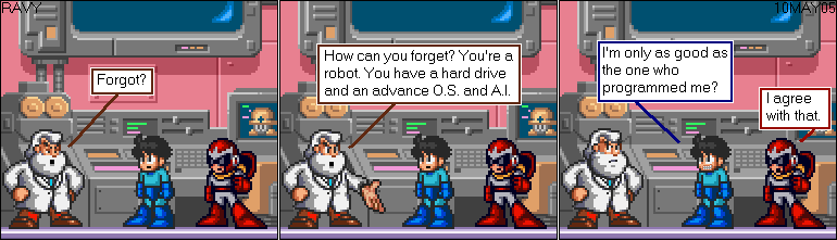Robots are forgetful. Hack sprite comic trope from the early 2000's.